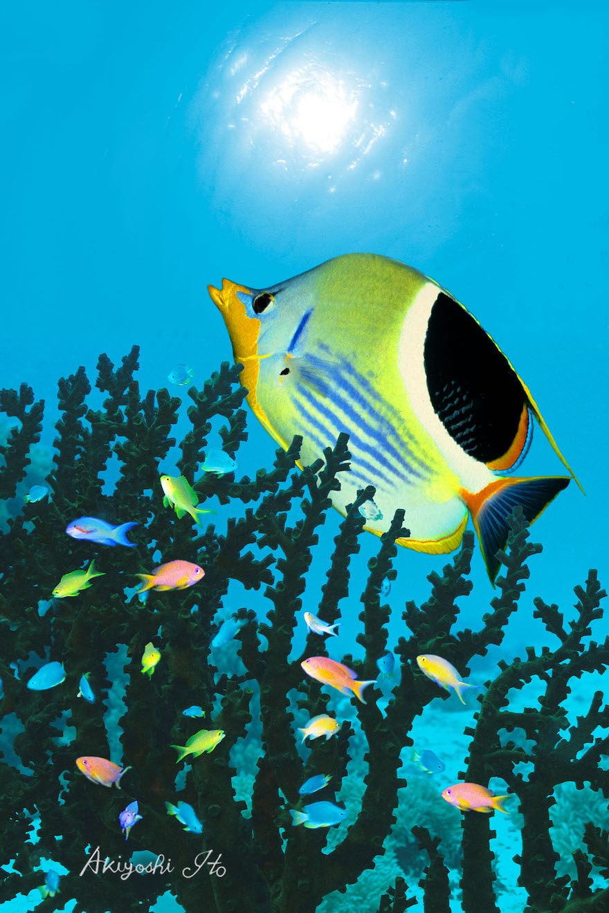 『セグロチョウチョウウオ』君が、陽光に映し出させると、ようやく元気を取り戻していた。すると、美しい海がより一層美しく感じられた。彼は生命の尊厳をより大切にしながら、探していた夢に近づくためにその地を後にした。