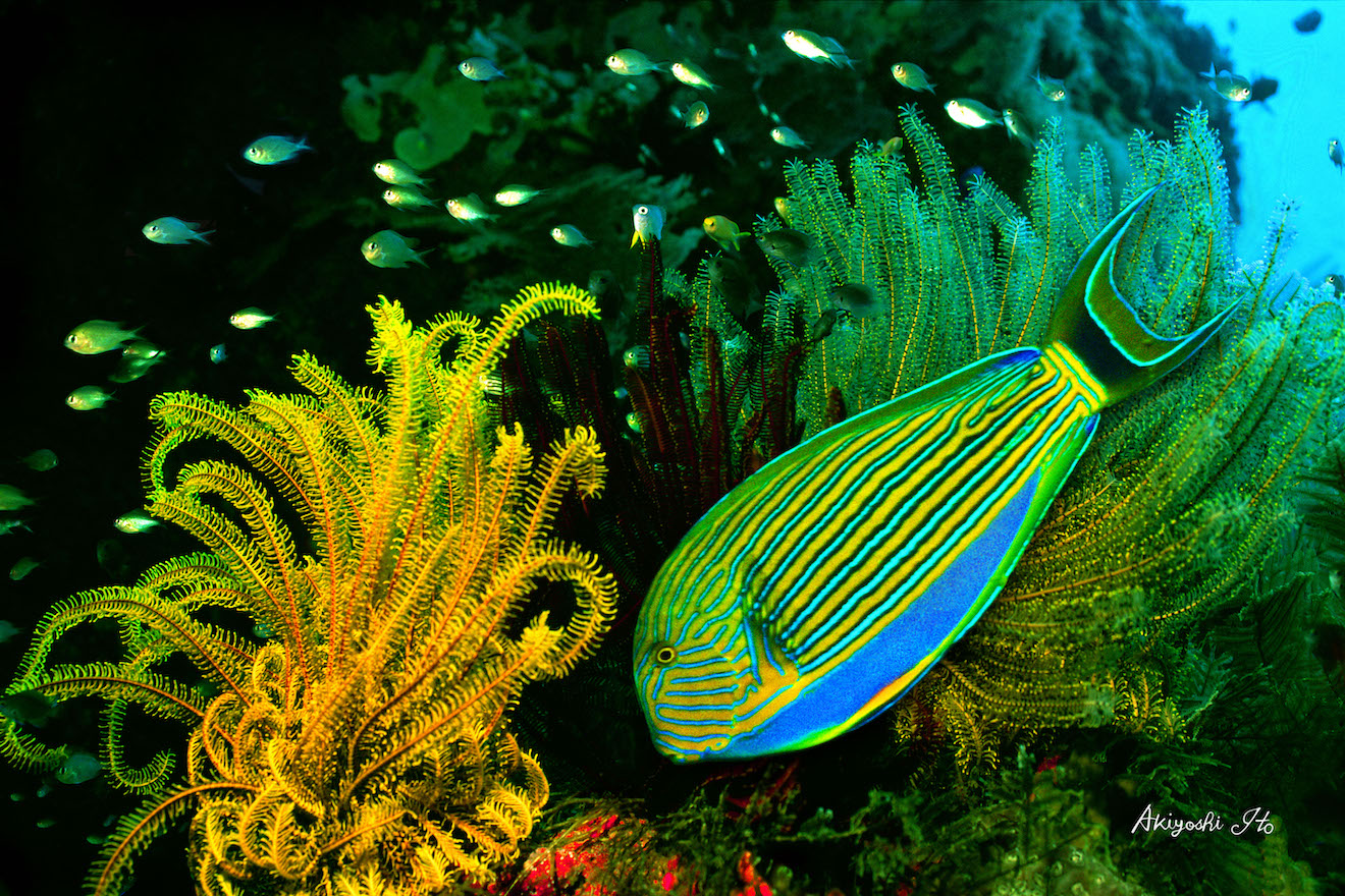 潮が流れてきてプランクトンが運こばれると今まさに半分だけ開きかけた黄色いウミシダが、特異なシルエットん放っていた。そこへ、どうしたの?…ばかりに駆けつけた『ニジハギ』の姿もまた美しい。海には美の原型が残っていた。