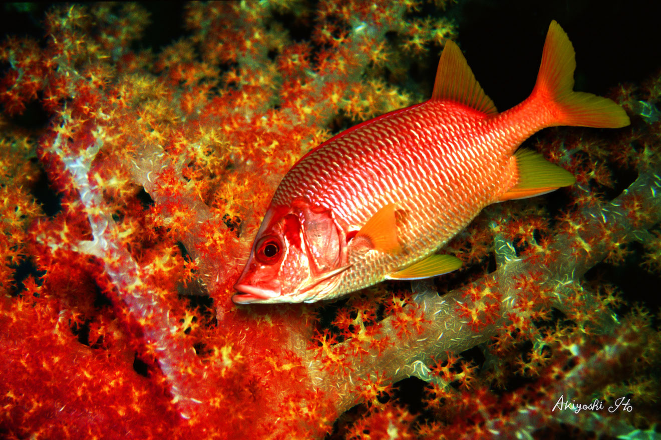 パラオにお花畑という名のポイントがある。とにかく『トゲトサカ』の色の種類が多い。そこに浮かび上がったオレンジと黄色の混合種。その艶やかさに負けじと登場した『トガリエビス』。それは美しさが競い合う命の結晶だ。