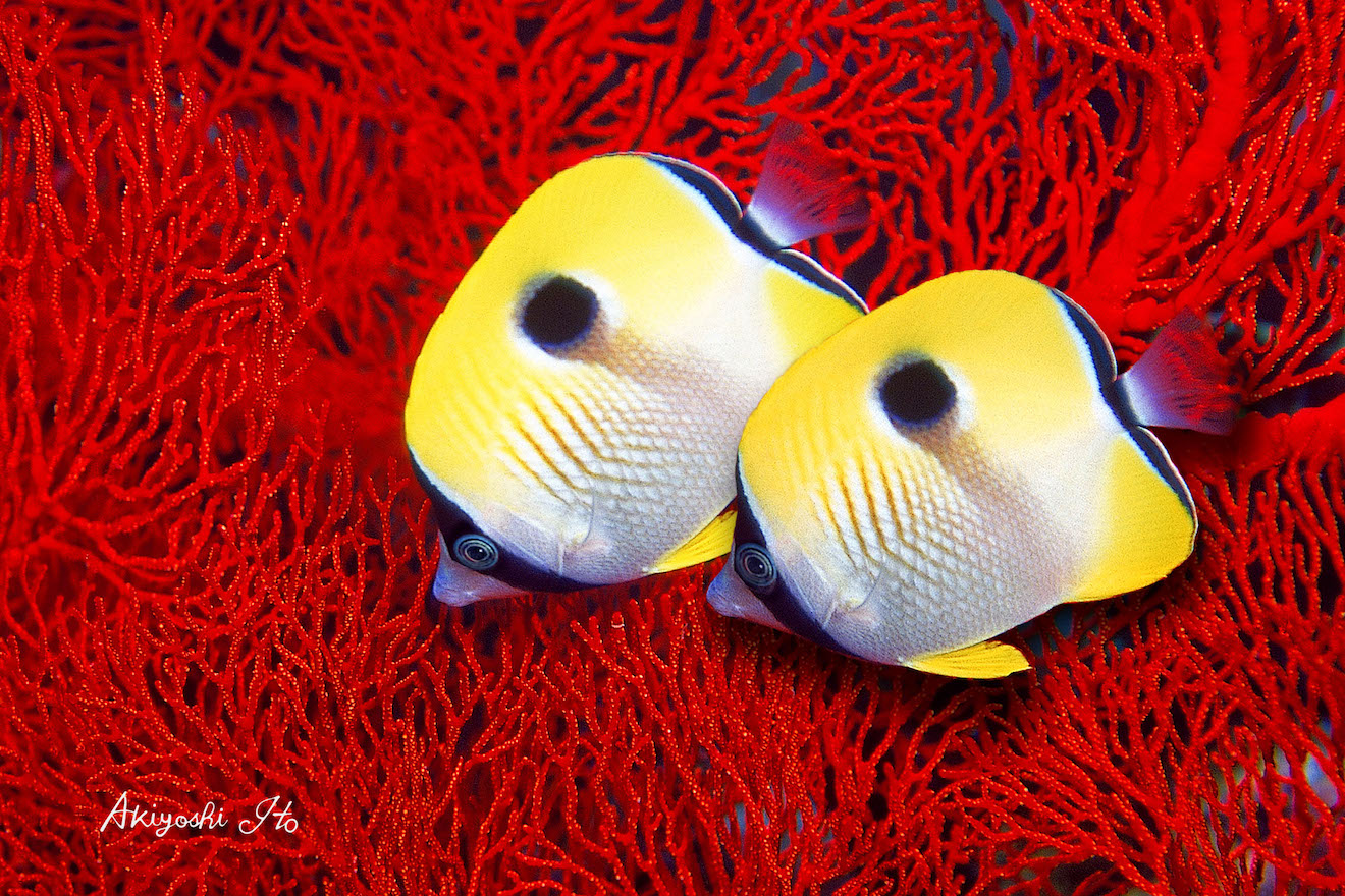 細く絡み合うように真っ赤なサンゴが海を独り占めしていた。そこへ、負けじと2匹並んで姿を見せたのは『イッテンチョウチョウウオ』だ。とにかく沖縄の清潔感のあるサンゴの赤は世界に類を見ない。その赤は愛となり光になった。