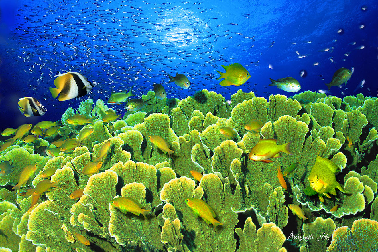 通称「キャベツ畑」名付けられたサンゴ礁。キャベツの葉に似ているからだ。『メラネシアンアンティアス』が体色を同化させて生活を共にしていた。太陽の光に無数の小魚たちが命の 賑わいを見せていた。