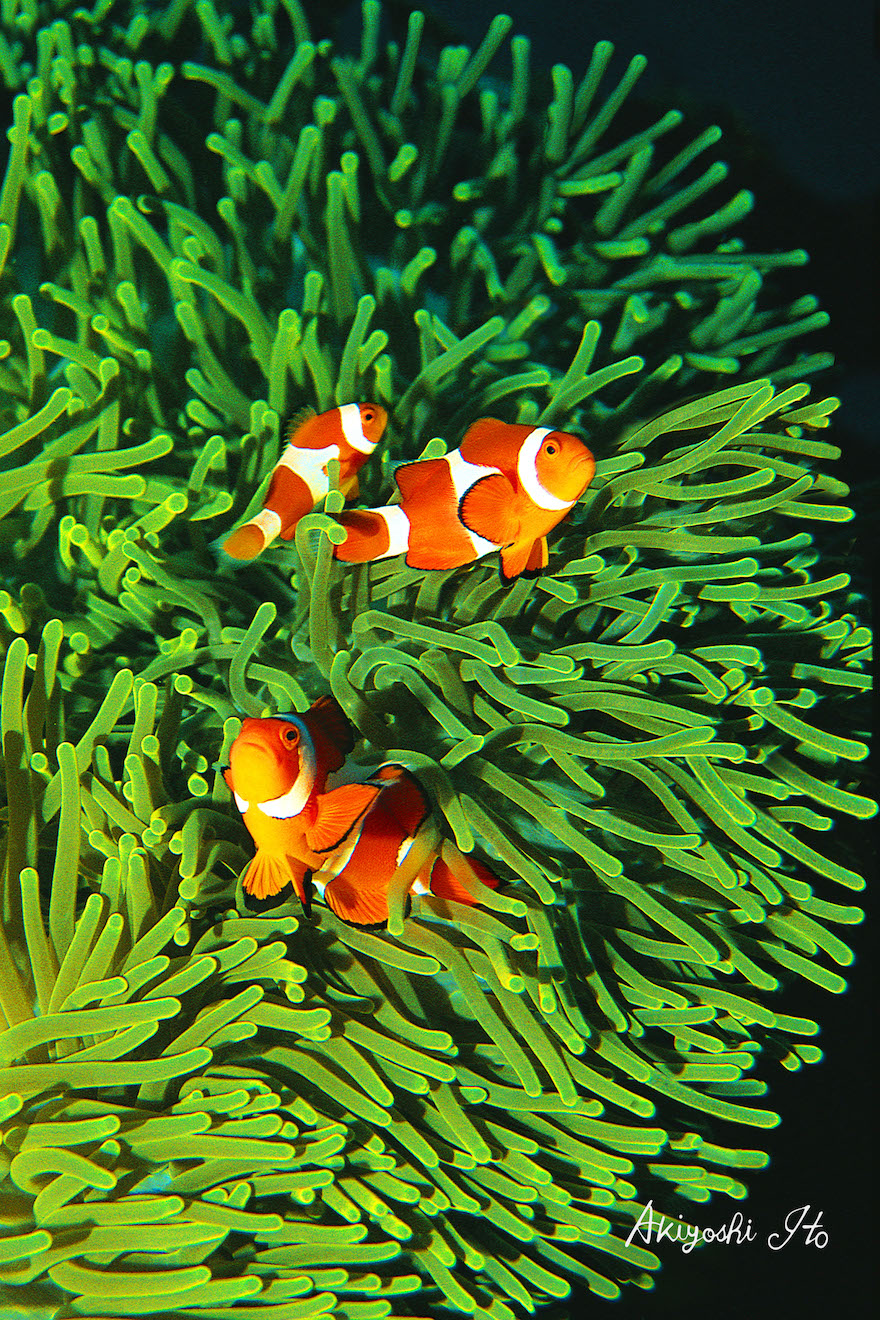 暗闇の中で、ライトアップされた『カクレクマ ノミ』の一家が驚きの表情を隠せなかった。綺麗な緑色のイソギンチャクと平穏に暮らしていたからだ。驚かせてしまったが、この幸せを何時までも感じていたいと思っていたに違いない。