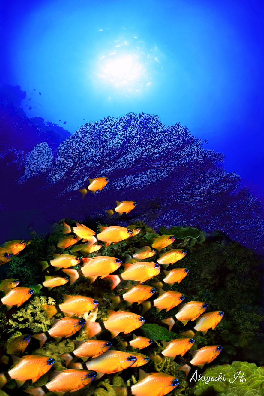 岩棚から太陽に向かってそびえ立つフトヤギが幻想的に浮かび上がった。『アオスジイシモチノウオ』の群れが競り合うように暮らしていた。かれらの眼のアオスジが蛍光色に輝いていて美しい。それは命の煌めきである。