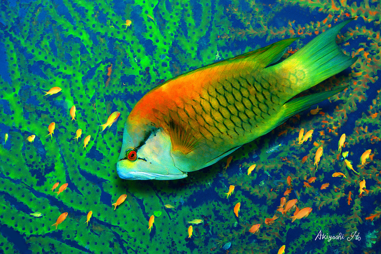緑色の硬質で特異なデザインのサンゴにキンギョハナダイが戯れてた。『ギチベラ』がふと立ち止まり、もの思いにふけっていた。昔の仲間たちのことを思い出したからだ。彼は振り返るのは今日限りにしよう…と呟いて立ち去った。