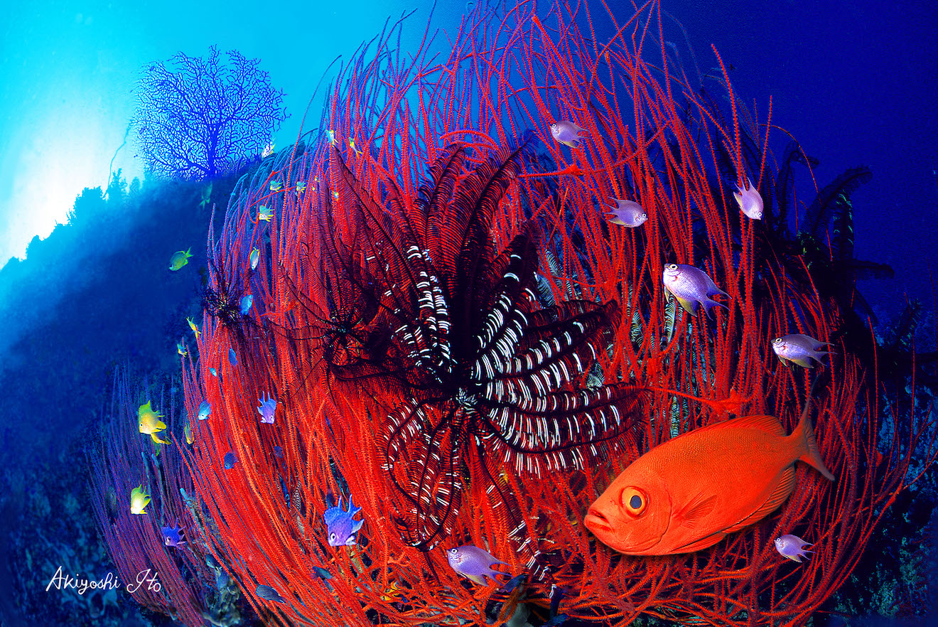 アカヤギが見事なシルエットを浮き彫りにし、そこを棲家とするスズメダイがクロシダを囲んで円を描いた。『ホウセキキントキ』が同系色のヤギに身を沈め辺りを警戒していた。丘の上には一本の木が寂しげに佇んでいた。